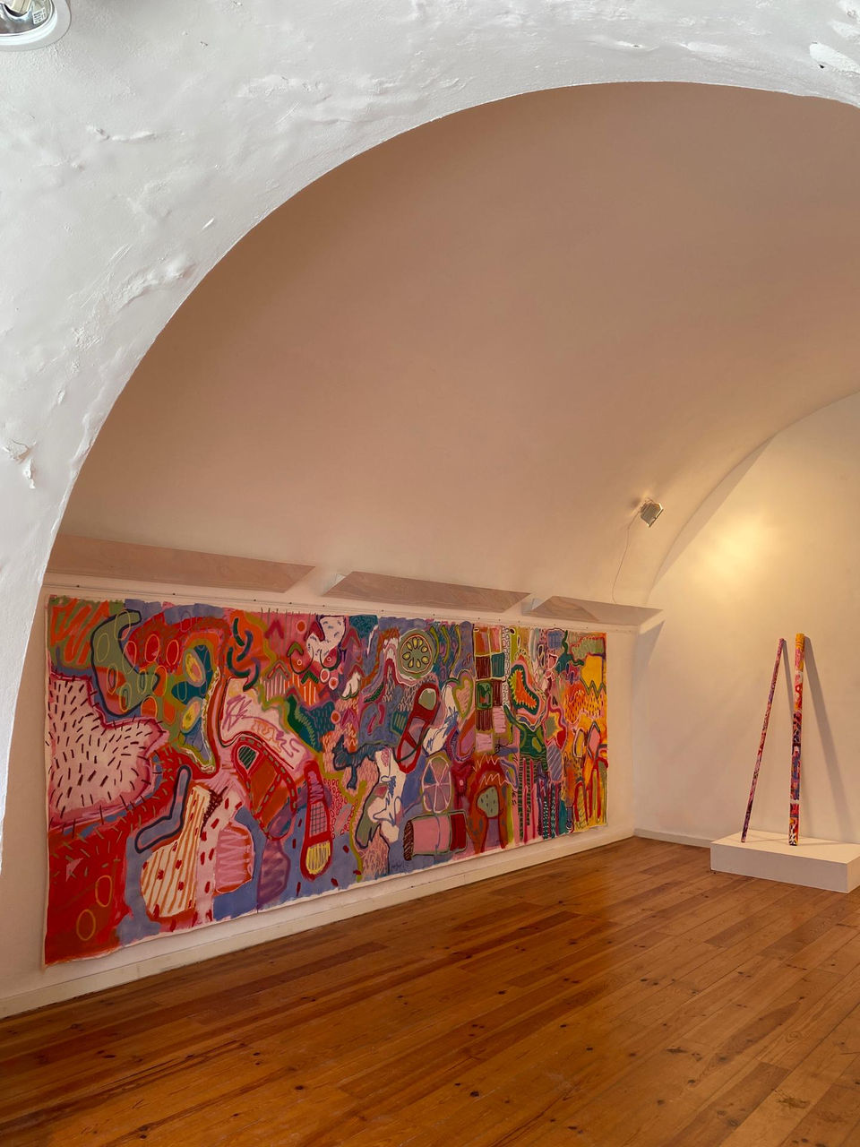 Pode a pintura ser assim? Pode, tudo é possível na practica artística, até a sua falsa desvalorização. O Dadá mostrou isso, a Arte Povera, os métodos da Arte Pop de repetição, cópia e vulgaridade. Neste rolo temos um pouco disso tudo, de Pop, de Neo Dadá (pela provocação e como se fosse um falso “cadravre exquis”), de Expressionismo Abstracto a lembrar um daqueles enormes lofts nova iorquinos, e um mural, sim, um mural que será desmontado tal Muro de Berlim e vendido em peças.